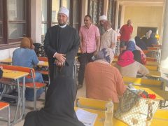 الدكتور عبد العزيز أبو خزيمة، رئيس الإدارة المركزية لمنطقة الإسكندرية الأزهرية، يتابع اختبارات نهاية المستوى برواق العلوم الشرعية والعربية، يرافقه الشيخ عبد الكريم إبراهيم، موفد الجامع الأزهر للإشراف على الاختبارات، والشيخ محمود ماهر، مدير الرواق بالإسكندرية؛