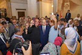 جموع منسوبى جامعة القاهرة تسابقوا لالتقاط الصور التذكارية مع د. الخشت والذى حرص على مصافحة الجميع فى مشهد إنساني بالغ الدلالة على عمق العلاقة مع رئيس الجامعة