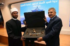 فى ختام الزيارة قدم الفريق أسامة ربيع رئيس الهيئة درع قناة السويس إلى الأستاذ الدكتور أسامة الأزهري وزير الأوقاف.