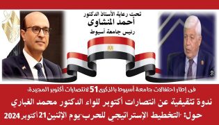 في إطار احتفالات جامعة أسيوط؛ بذكرى انتصارات أكتوبر المجيدة؛ تنظم الجامعة، تحت رعاية الدكتور أحمد المنشاوي رئيس الجامعة؛ ندوة تثقيفية، لغرس روح الولاء، والانتماء، ونشر الوعي بين طلبة الجامعة، للواء الدكتور محمد الغباري مستشار مدير أكاديمية ناصر العسكرية، بعنوان: “التخطيط الإستراتيجي للحرب، والدفاع الإستراتيجي”، وذلك يوم الإثنين الموافق ٢١ من أكتوبر؛ ضمن احتفال الجامعة؛ بإحياء الذكرى (٥١) لانتصارات أكتوبر المجيدة، وذلك بقاعة المؤتمرات الكبرى بالجامعة.