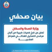 تعلن وزارة الصحة والسكان عن ضخ كميات كبيرة من ألبان مرضى التمثيل الغذائي للمراكز العلاجية، وذلك في إطار جهود الوزارة المستمرة لضمان توفير الألبان بانتظام وبدون انقطاع.