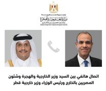 جرى اتصال هاتفي بين د. بدر عبدالعاطي وزير الخارجية والهجرة ومعالي الشيخ محمد بن عبدالرحمن آل ثاني رئيس الوزراء ووزير خارجية دولة قطر الشقيقة.