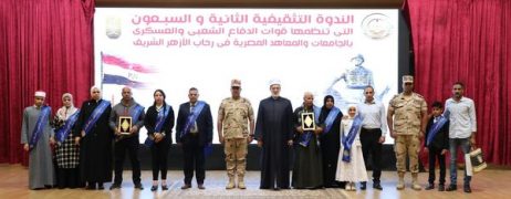 وشهدت الندوة تكريم عدد من أسر الشهداء، وطلاب المعاهد الأزهرية من ذوي الهمم، كما قام اللواء أركان حرب أسامة عبد الحميد داود، قائد قوات الدفاع الشعبي والعسكري، وفضيلة أ.د محمد الضويني، وكيل الأزهر، بتبادل الدروع التذكارية، وفي الختام وقف الجميع تعظيمًا للسلام الوطني لجمهورية مصر العربية.