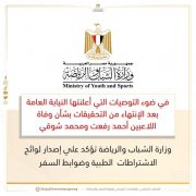 فى ضوء توجيهات السيد الرئيس عبد الفتاح السيسي رئيس الجمهورية بشأن حوكمة المنظومة الرياضية وفى إطار التوصيات التى صدرت اليوم عن النيابة العامة بعد الانتهاء من التحقيقات بشأن وفاة اللاعبين احمد رفعت ومحمد شوقي. أعلنت وزارة الشباب والرياضة عن الانتهاء من اصدار اللوائح الطبية ولائحة إجراءات وضوابط السفر .