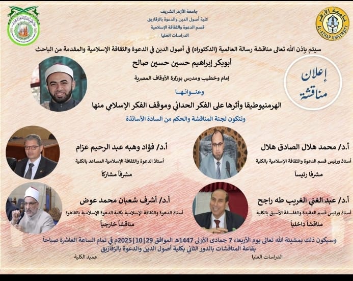 نوقشت رسالة دكتوراه بقسم الدعوة بكلية أصول الدين بالزقازيق تقدم بها الباحث ابو بكر ابراهيم حسين صالح وعنوانها ( الهرمنيوطيقا وأثرها على الفكر الحداثي وموقف الفكر الإسلامي منها، ) وهو موضوع – كما يؤكد الباحث – يُعالج أحد أخطر التحولات الفكرية في الفكر الغربي الحديث، وما أفرزته من تأثيراتٍ على مناهج قراءة النصوص، ولا سيما النصوص الدينية.