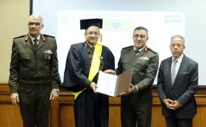 ستمراراً لجهود القوات المسلحة فى إعداد وتأهيل الكوادر الطبية المتميزة من العسكريين والمدنيين وفقاً لأرقى مستويات التأهيل العلمى ، وحرصاً منها على مواكبة التطور المتلاحق فى مختلف المجالات الصحية ، نظمت الأكاديمية الطبية العسكرية مراسم تسليم الشهادات وتكريم الحاصلين على الألقاب العلمية وحملة الماجستير والدكتوراه والبورد المصرى من الأطباء العسكريين والمدنيين الدارسين بالأكاديمية .